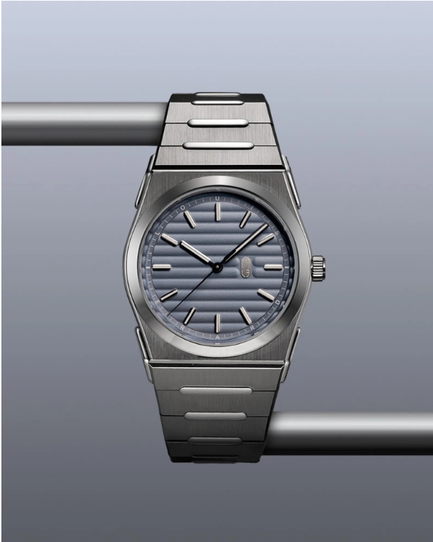 - The 40 mm case, 8.95 mm thick, combines a matte titanium case with polished stainless steel center links, creating a visually rich and textured finish.